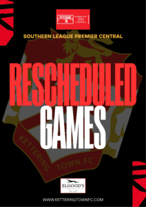 Kettering Town’s rescheduled Southern League Premier Central fixture against Stratford Town is to be played on Tuesday 3rd March 2026 at Latimer Park kick off