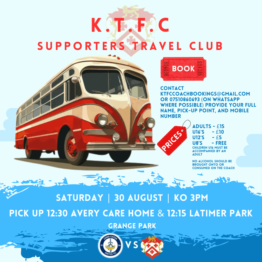 To book your place, please contact ktfccoachbookings@gmail.com or 07510860693 (on WhatsApp where possible) and provide your full name, pick-up point, and mobile number.