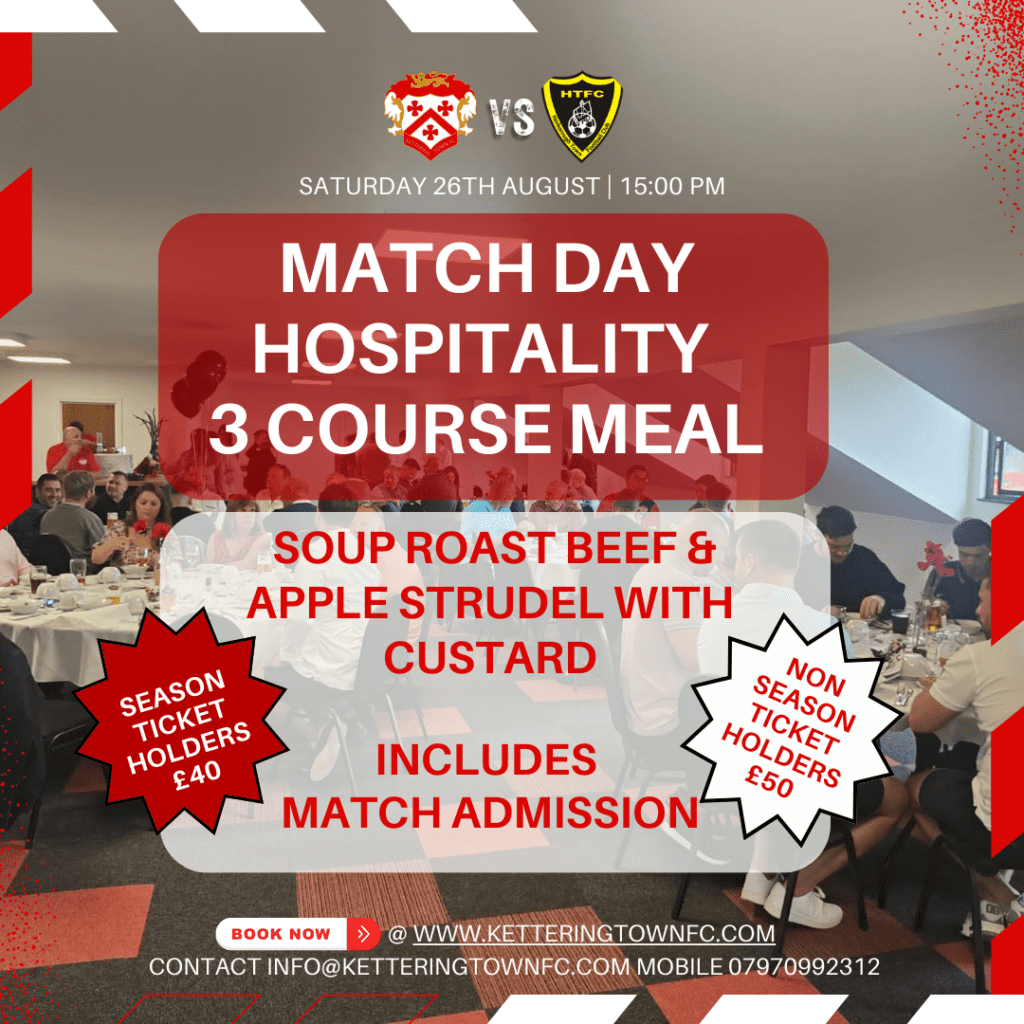 KTFC Match Day Hospitality Packages Exclusive Offer: Ahead of our first home match on Tuesday 13th August we have a number of Match Day Hospitality Packages and sponsorship opportunities available. To book any of our Match Day Hospitality Packages contact info@ketteringtownfc.com or call Mobile 07970992312. For Further details on each package check out www.ketteringtownfc.com