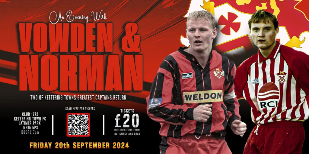 Book your tickets for an evening with two KTFC legends and former team captains, Craig Norman and Colin Vowden on Friday 20th September 2024 at 19:00 food by Smash & Grab included in your £20 per ticket. Click on https://app.fanbaseclub.com/club/kettering-town-fc, scan the QR code or purchase tickets at the Social Club.