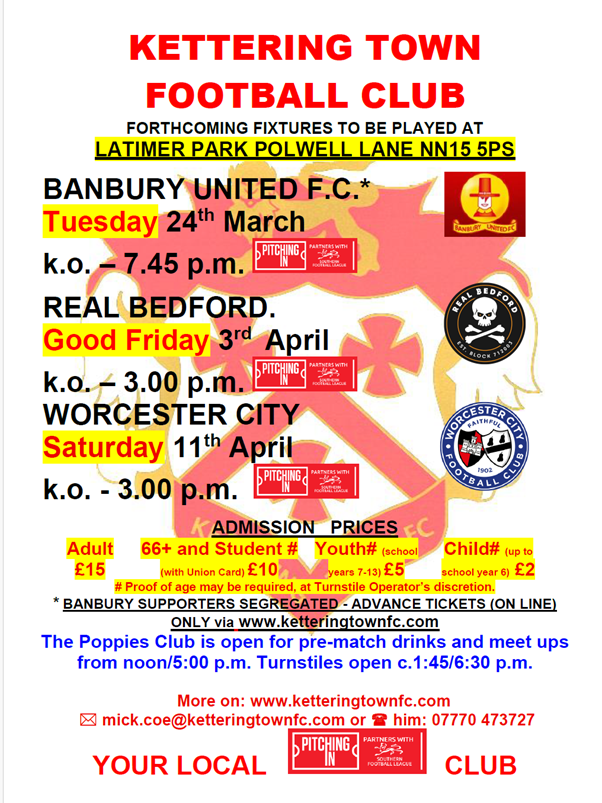 Out of courtesy to away supporters attending Tuesday’s Southern League Premier Central match Kettering Town vs Banbury United kick off 19:45 we would like to