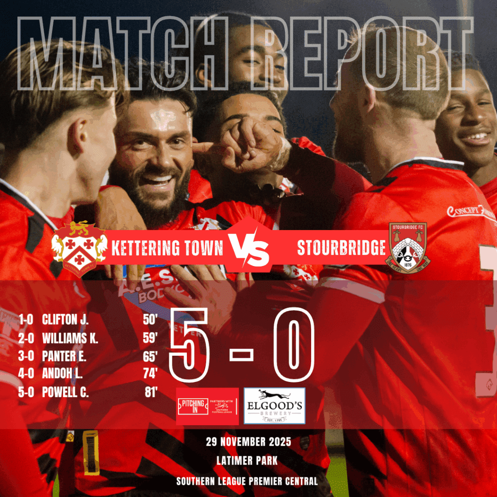 A very welcome three points at home with a great bounce back win after three disappointing results on the road. Every player including the substitutes performed well and this result can do nothing but improve the morale of the squad. Kai Williams impressed being used in a wider role rather than centrally as he has been utilised in previous games. Hopefully, this will steady the Kettering ship but Stourbridge are at the bottom of the table for a reason so guarded optimism abounds.