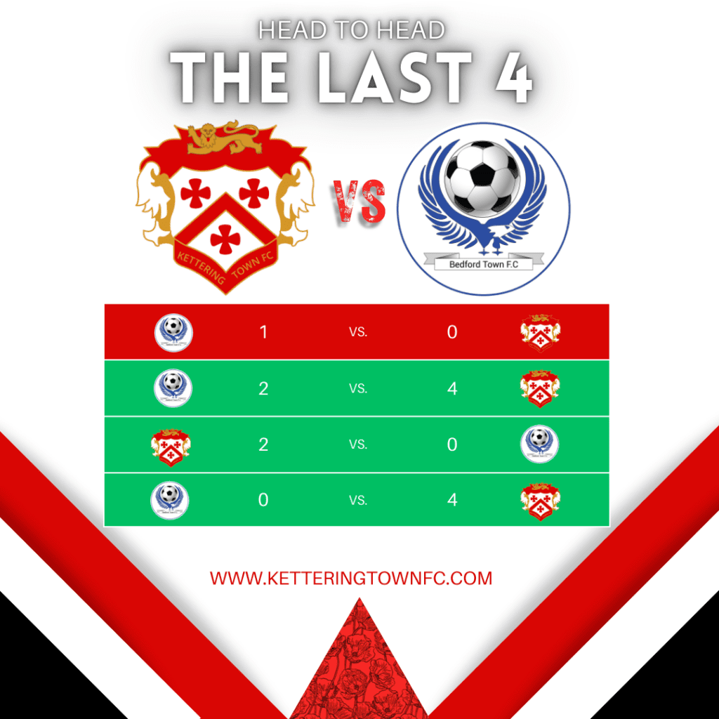 Kettering Town’s winning streak continued this week with a resounding 1-3 victory away to a combative AFC Telford United side, which is a stark contrast to the visitors to Latimer Park today, Bedford Town FC, who have sustained four losses in their last six matches the most recent of which was at home vs St Lives 0-3. However, Bedford Town have recently beaten both Bromsgrove (0-3) and Stamford (2-3) and lie eighth in the league eight points behind league leaders KTFC. Classed as a local derby, Bedford will bring a good travelling support today so it promises to be a great game. Enjoy the match. COYP!